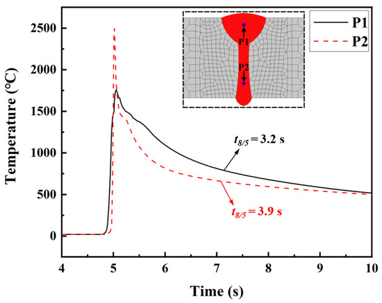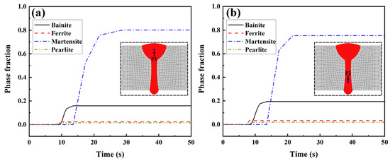 Figure 9 illustrates the historical temperature data obtained from the numerical simulation at points P1 and P2. Point P1 is located in the FZ of the arc zone in the LAHW joint, while point P2 is situated in the FZ of the laser zone. Compared with the temperature history at point P1, the peak temperature at point P2 was higher, and the cooling rate in the high-temperature stage was faster. But the t8/5 values at points P1 and P2 were similar. This result is mainly because the welding heat input from laser welding is more concentrated than that of arc welding. Therefore, the cooling rate in the laser welding area was faster than that in the arc welding area at high temperatures. As the temperature decreased, the temperature gradient of the LAHW joint slowed down, and the t8/5 values at points P1 and P2 were relatively close. Figure 10 displays the calculated phase fractions at points P1 and P2. The figure shows that the martensite content in the FZ was the highest, nearing 0.8, followed by the bainite content, which was around 0.2. The ferrite and pearlite contents were very low. The main reasons for these phenomena are the low heat input and fast cooling rate of the LAHW joint.