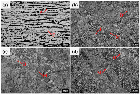Microstructures of the LAHW joint: (a) base metal; (b) fine grain zone; (c) coarse grain zone; (d) FZ.