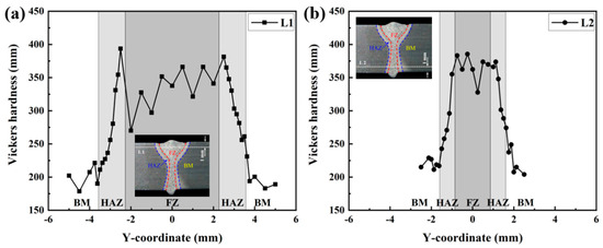 Figure 11 displays the microstructure of each region in the LAHW joint. The microstructure in the base metal was mainly composed of ferrite and pearlite. The fine grain zone primarily consisted of martensite, granular bainite, and ferrite. The microstructure in the coarse grain zone was predominantly composed of lamellar martensite, with a small amount of bainite. Martensite and black acicular bainite can be observed in the FZ. Figure 12 illustrates the hardness distributions at a distance of 1 mm from the upper and bottom surfaces of the LAHW joint. The figure shows that the hardness of the FZ in the LAHW joint was in the high hardness range, with a peak hardness of 393.6 HV. The SH-CCT diagram of Q345 steel in Figure 5 indicates that the microstructure with a hardness of 393.6 HV mainly consisted of martensite, with a minor bainite presence. This fact is mainly due to the small heat input and fast cooling rate of LAHW, resulting in many martensite microstructures in the FZ. The calculated phase fraction in Figure 10 corresponds to the microstructure and microhardness of the actual LAHW joint in Figure 11 and Figure 12, indicating the rationality of the calculated temperature field and the established SSPT model in the numerical simulation.