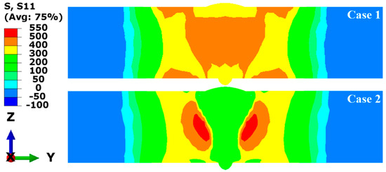 Figure 14 illustrates the transverse RS distributions of the middle cross-section in Case 1 and Case 2. The plotted results show that the transverse RS distributions in the two cases were significantly different in the FZ and the area away from the FZ. In Case 1, the high tensile RS occurred on the upper and bottom surfaces away from the FZ, and the RS in other areas exhibited low tensile stress or low compressive stress. Observing Case 2, the high tensile RS can be found at the weld toe of the upper and bottom surfaces and in the middle area of the plate’s thickness near the HAZ, while the high compressive RS is distributed on the upper and bottom surfaces near the HAZ. This suggests that SSPT not only has an important impact on the transverse RS distribution in and near the FZ but also reduces the high tensile RS on the upper and bottom surfaces away from the FZ.