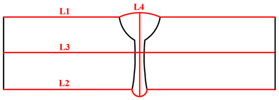 To quantitatively study the effect of SSPT on the welding RS distribution, the RS distributions along Paths L1, L2, L3, and L4 were compared. The path schematic in the middle cross-section of the LAHW joint is shown in Figure 15. Figure 16a shows the simulated and experimentally measured longitudinal RS distributions along Path L1. The experimental error of the hole-drilling strain method was approximately ±50 MPa [28]. In Case 1, the high tensile RS occurred in and near the FZ and HAZ. As the distance from the FZ and HAZ increased, the tensile RS decreased rapidly in the ranges of −8 mm < Y < −16 mm and 8 mm < Y < 16 mm, eventually transitioning into compressive RS. Comparing Case 1 and Case 2, it is evident that the overall tensile RS in and near the FZ and HAZ in Case 2 was significantly lower than that in Case 1. The peak value of the longitudinal RS in Case 1 was 454.2 MPa while that in Case 2 was 382.9 MPa. The SSPT can reduce the peak value of the longitudinal RS on the upper surface by 15.7%. The magnitude and distribution of the longitudinal RS away from the FZ in Case 2 remain nearly identical to those in Case 1. Comparing the experimental values and simulated values, it can be found that the longitudinal RS simulated in Case 2 more closely approximated the experimental measurement than that simulated in Case 1. This result indicates that the material model that does not consider SSPT will grossly overestimate the longitudinal RS of Q345 steel LAHW joints. The longitudinal RS distributions along Path L2 predicted by Case 1 and Case 2 are shown in Figure 16b. The overall “low–high–low” distribution trend in the longitudinal RS on the bottom surface was very similar to that on the upper surface. The peak values of the longitudinal RS for Case 1 and Case 2 were 453.1 MPa and 387.8 MPa, respectively. The SSPT can reduce the peak value of the longitudinal RS on the bottom surface by 14.4%.