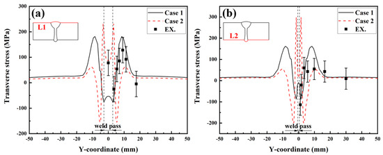 Figure 17 displays the transverse RS distributions along Paths L1 and L2 simulated by the FE method with the corresponding experimental measurements. From Figure 17a, it can be seen that the transverse RS profile of Case 1 was M-shaped but that of Case 2 was W-shaped. A comparison between Case 1 and Case 2 reveals that the transverse RS distributions in these two cases were obviously different, in the range of −15 mm < Y < 15 mm. The transverse RS in the ranges of Y < −15 mm and Y > 15 mm were almost identical and near 0 MPa. By observing Figure 17b, it becomes evident that the distribution trends in the transverse RS in both Case 1 and Case 2 closely resemble those observed in Figure 17a. Comparing the experimental values and simulated values in Figure 17a,b, it can be found that the transverse RS simulated by Case 2 was in better agreement with the experimental measurements.