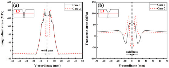 Figure 18 presents the longitudinal and transverse RS distributions along Path L3 simulated in Case 1 and Case 2. Figure 18a illustrates that the longitudinal RS in the FZ and HAZ in Case 2 is significantly lower than that in Case 1. The peak value of the longitudinal RS in the FZ and HAZ in Case 1 and Case 2 are 436.3 MPa and 184.1 MPa, respectively. Considering SSPT into the material model can reduce the peak value of the longitudinal RS in the FZ and HAZ at the middle of the plate’s thickness by 57.8%. Further observation shows that the longitudinal RS in the base metal near the HAZ in Case 2 is higher than that in Case 1. This phenomenon occurs mainly because the expansion of the FZ and HAZ induced by the SSPT increases the restraint intensity of the base metal near the HAZ [29]. Figure 18b illustrates that the transverse RS simulated in Case 2 was lower than that simulated in Case 1, in the range of −3.6 mm < Y < 3.6 mm. The peak value of the transverse RS in the FZ in Case 1 was 60.2 MPa, while that in Case 2 was 1.9 MPa. In the ranges of −15 mm < Y < −3.6 mm and 3.6 mm < Y < 15 mm, the transverse RS in Case 2 was higher than that in Case 1. The transverse RS values modeled in these two cases were similar, in the ranges of Y < −15 mm and Y > 15 mm.
