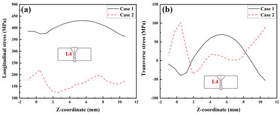 Figure 19 shows the longitudinal and transverse RS distributions along Path L4. By observing Figure 19a, the average value of the longitudinal RS in Case 1 was 363.3 MPa while that in Case 2 was 172.7 MPa. This information suggests that SSPT can reduce the average value of the longitudinal RS in the FZ by 52.5%. According to Figure 19b, SSPT increases the transverse RS in the FZ near the upper and bottom surfaces. In the middle area of the plate’s thickness (in the range of 1.6 mm < Y < 8.2 mm) in the FZ, the SSPT can reduce the transverse RS. From Figure 19a,b, it can be concluded that the SSPT significantly reduced the longitudinal RS in the FZ of the LAHW joint and that it had a more complex impact on the transverse RS distribution. This fact is mainly because the transverse RS distribution is not only affected by the SSPT in the FZ and HAZ but also by changes in the longitudinal RS caused by the SSPT [30].