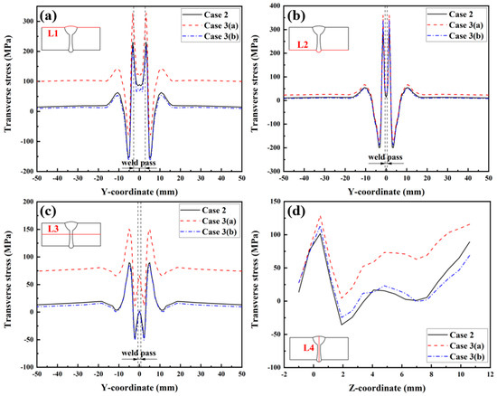 Figure 23 illustrates the transverse RS distributions along Paths L1, L2, L3, and L4. Observing Figure 23a,c, it is evident that the transverse RS simulated by Case 3 (a) is obviously higher than that simulated by Case 2. This information indicates that the transverse restraint significantly increases the transverse RS of the upper surface and middle area of the plate’s thickness in the LAHW joint. After releasing the transverse restraint, the transverse RS of the LAHW joint decreases and restores to a level comparable to that of the welded joint under free condition (Case 2). A similar phenomenon can be found in Figure 23b, but the transverse RS in Case 3 (a) along Path L2 was only slightly higher than that in Case 2 and Case 3 (b). Figure 23a–c show that the transverse restraint increases the transverse RS by about 90 MPa on the upper surface, 60 MPa in the middle area of the plate’s thickness, and only 10 MPa on the bottom surface. This phenomenon is mainly related to uneven transverse shrinkage deformation in the plate’s thickness direction of the LAHW joint. Figure 24 compares the transverse shrinkage deformations along Paths L1, L2, and L3 as predicted in Case 2. The weld groove on the upper surface of the LAHW joint was larger than the weld groove on the bottom surface, resulting in the largest transverse shrinkage deformation on the upper surface (Path L1), followed by the middle area of the plate’s thickness (Path L3), and the smallest on the bottom surface (Path L2). The transverse shrinkage deformation of the LAHW joint under transverse restraint conditions (Case 3-a) is limited. The limited transverse shrinkage deformation on the upper surface was greater than that on the bottom surface. Therefore, the increment in the transverse RS induced by the transverse restraint on the upper surface was much higher than that on the bottom surface. A similar phenomenon was found in the transverse RS distribution along Path L4, as shown in Figure 23d.