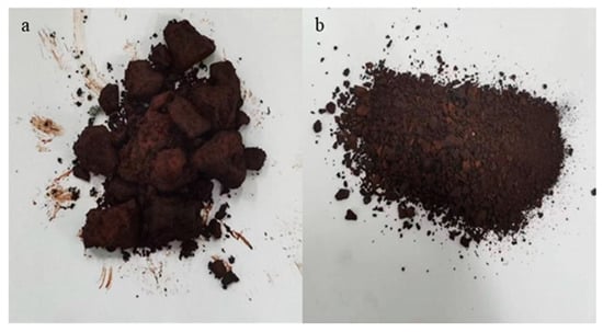 The copper-containing sludge utilised in the experiment originated from an environmental protection technology company in Suqian, China, as illustrated in Figure 1. The raw material of the copper-containing sludge (a) exhibits a dark brown colour and a tightly bonded mud-like texture. The larger lumps have a tightly bonded mud-like texture, as shown in Figure 1. After drying, the volume of the copper-containing sludge shrinks drastically due to the high water content of the internal material, which is 68.6%.