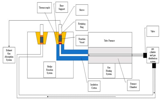 Figure 2 depicts the schematic diagram of the experimental setup, which comprises four systems: the gas cylinder and gas shunt system, the gas heating system, the sludge reaction system, and the tail gas absorption system. The atmosphere required for the experiment is provided by the gas cylinder. Initially, the gas flow is regulated by the gas shunt system, with the valve on the left side open and the valve on the lower side closed. Subsequently, the gas is heated as it passes through a stainless steel pipe within the chamber of the tube furnace. Subsequently, the heated gas enters the sludge reaction system via a stainless steel pipe insulated with heat-preserving cotton. The stainless steel pipe is connected to the bottom bracket, which serves to embed the casing equipped with thermocouples from the bottom to the top. The thermocouples provide the real-time measurements of the gas temperature. A ring is employed to maintain the position of the reaction pack, within which the sludge is placed and reacted. Subsequently, the exhaust gas flows through the end of the casing into the tail gas absorption system, where it is processed. To regulate the protective atmosphere, it is necessary to close the valve on the left side and open the valve on the lower side. Once the reaction has reached completion, the sludge is cooled and removed for testing. This occurs following the oxidative decomposition stage, which occurs at temperatures between 850 °C and 950 °C, and the reductive stage, which occurs at temperatures between 750 °C and 850 °C.