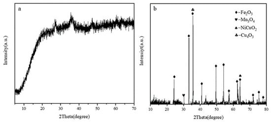 An X-ray fluorescence analysis equipment (XRF) was employed to conduct a semi-quantitative analysis of the principal elements present in copper-containing sludge. The results of this analysis are presented in Table 1, which indicates that the content of Cu in the copper-containing sludge was 2.44%. This percentage is of high significance for recycling and application, with a content of Fe as high as 38.14%. The dark brown colour of the raw material containing copper-containing sludge may be due to the presence of Fe-containing compounds such as iron hydroxide and iron oxide. The physical phase of the copper-containing sludge was analysed by an X-ray diffraction (XRD, Bruker, in Karlsruhe, Germany) equipment. The original copper-containing sludge XRD diagram in Figure 3a shows that there are no obvious diffraction peaks, indicating that the metal in the original copper-containing sludge mainly exists in an amorphous form. The chemical deposition method employed in the treatment of the original copper-containing sludge may have resulted in the formation of metals in the form of amorphous hydroxides, which prevented the observation of characteristic peaks for iron, copper, and other elements in the original copper-containing sludge. As illustrated in Figure 3, the XRD diagram (b) of the calcined copper-containing sludge reveals that the predominant metals in the original copper-containing sludge existed in the form of metal oxides following calcination. The major compositions of the calcined copper-containing sludge were: Fe2O3, Mn3O4, NiCuO2, Cu4O3, and so on, and the copper existed in the copper-containing sludge after calcination in the form of NiCuO2 and Cu4O3.