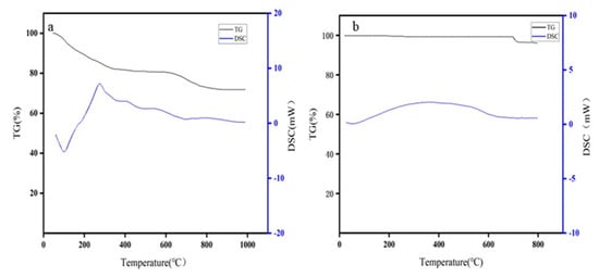 From Figure 4 of the TG-DSC curve of copper-containing sludge under an oxidizing atmosphere (a), it can be observed that the TG curve remains relatively unchanged at 850 °C, with a mass loss of 28.21%. Additionally, the DSC curve indicates that under an oxidizing atmosphere, the indeterminate hydroxides in the copper-containing sludge decomposed among themselves, resulting in a clear heat absorption peak. From Figure 4 TG-DSC curve of copper-containing sludge under reducing atmosphere (b), it can be seen that the TG curve tends to be unchanged at 750 °C, with a mass loss of 3.94%. From the DSC curve, it can be observed that the reduction reaction of NiCuO2 and Cu4O3 in the copper-containing sludge occurred under a reducing atmosphere, resulting in an evident exothermic peak.