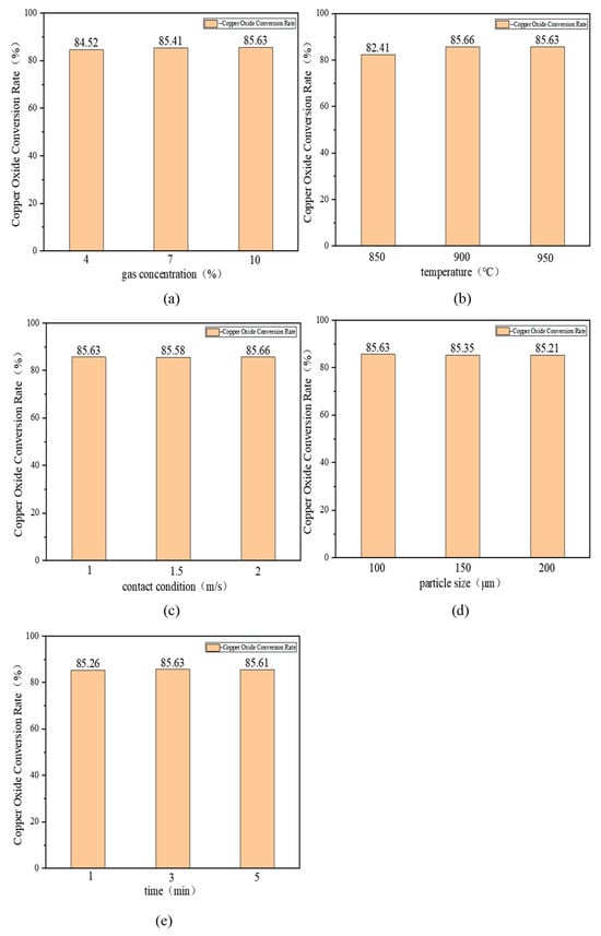 Figure 5d illustrates the variation in the conversion rate of copper oxide in the copper-containing sludge with different particle sizes (100 μm, 150 μm, and 200 μm) under the following specified conditions: a gas concentration of 10%, temperature of 950 °C, contact condition of 1 m/s, and reaction time of 3 min. From the figure, it can be observed that the conversion rate of copper oxides exhibited a slight increase with the reduction in particle size. The conversion of copper oxide increases from 85.21% to 85.35% for a reduction in particle size from 200 μm to 150 μm, and from 85.35% to 85.63% for a reduction in particle size from 150 μm to 100 μm. This may indicate that the diffusion of oxygen and the contact of reactants are sufficiently adequate within the experimentally set conditions to maintain an effective oxidative decomposition reaction even for larger particles (the particle size of the large particles is 200 μm). Overall, the particle size was chosen to be 100 μm.