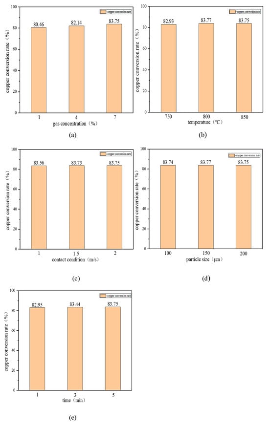 Figure 6 illustrates the variation in the conversion rate of the copper-containing sludge under different factors. Figure 6a depicts the variation in the copper conversion rate of the copper-containing sludge under different gas concentrations (1%, 4%, and 7%) at a constant temperature of 850 °C, a maintained contact state of 2 m/s, a fixed particle size of 200 μm, and a consistent reaction time of 5 min. As illustrated in the figure, the copper conversion rate exhibits a positive correlation with the gas concentration. The copper conversion rate demonstrates an upward trend, increasing from 80.46% to 82.14% when the gas concentration was elevated from 1% to 4%, and further increasing to 83.75% when the gas concentration was increased from 4% to 7%. Carbon monoxide, as a reducing agent, can effectively react with copper oxides and promote the reduction of copper when sufficient heat is provided. The increase in concentration means that the partial pressure of carbon monoxide in the reaction system is elevated, which provides more reducing conditions for copper oxides, which may lead to the forward progress of the copper reduction reaction, thus improving the copper conversion rate. Therefore, it can be concluded that the optimal gas concentration should be 7% (the chemical composition of the used gas is CO and N2).