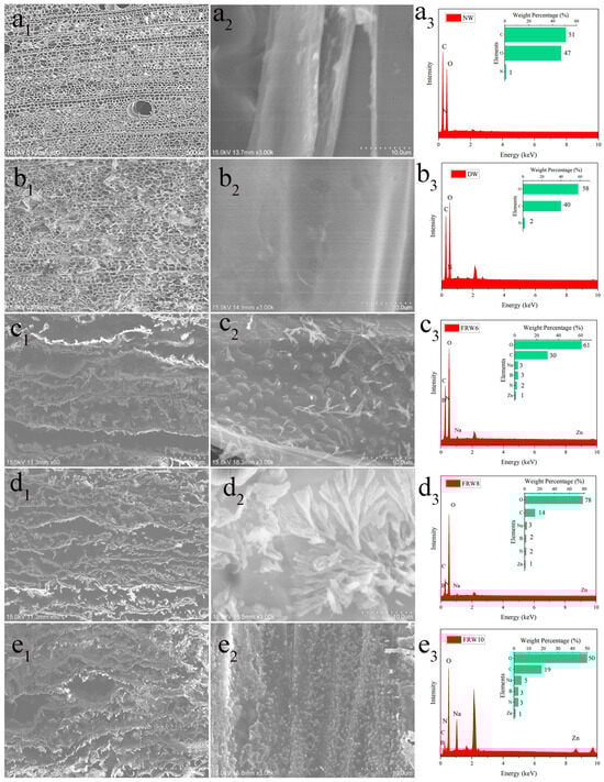 SEM image of NW (a1) cross-section, (a2) diameter section; DW (b1) cross-section, (b2) diameter section; FRW6 (c1) cross-section, (c2) diameter section; FRW8 (d1) cross-section, (d2) diameter section; FRW10 (e1) cross-section, (e2) diameter section, (a3–e3) is the EDS picture corresponding to (a2–e2).