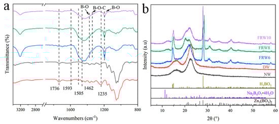 The temperature-dependent heat release rates (HRR) of the NW and different flame-retardant composite aerogels were investigated using a microscale combustion calorimeter, as illustrated in Figure 8a. The measured data, including total heat release (THR), peak heat release rate (PHRR), and corresponding temperature (Tmax), are tabulated in Table 3. It was observed that the HRR of the NW reached 210.2 W/g at a temperature of 338.24 °C, implying the rapid liberation of substantial thermal energy. In the presence of flame retardants, a significant reduction in the PHRR values of the aerogels was discerned, with the FRW6, FRW8, and FRW10 exhibiting values of 17.3 W/g, 17.5 W/g, and 18.4 W/g, respectively. Concurrently, the THR values decreased from 18.7 kJ/g to 3.8 kJ/g, 3.6 kJ/g, and 3.4 kJ/g for FRW6, FRW8, and FRW10, respectively, corresponding to reductions of 79.7%, 80.7%, and 81.8%. Notably, within the low-temperature domain (<250 °C), the PHRR and THR of the FRW10 were approximately halved in comparison to the FRW6, FRW8. These findings collectively underscore the efficacy of sodium borate and zinc borate particles in mitigating cellulose combustion and suppressing the release of internal pyrolysis byproducts. The discerned heat release rate trends further corroborate the flame-retardant attributes inherent in the engineered wood aerogels. The incorporation of sodium borate and zinc borate significantly enhances the thermal stability and flame-retardant characteristics of wood aerogels.