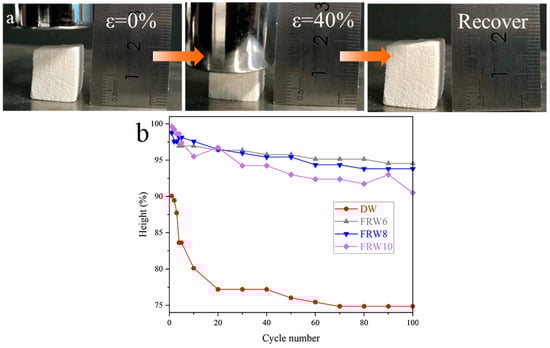 (a) Pictures of FRW10 compressing and releasing; (b) the constant strain is 40%, and there is a high retention rate in 100 compression/release cycles for different samples.