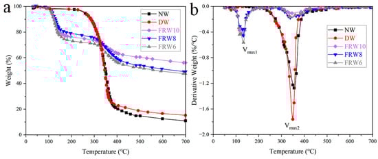 (a) TG; (b) DTG diagram of different samples. According to ASTM E2550 standard, samples were heated at a heating rate of 10 °C/min from 30 °C to 700 °C under an N2 atmosphere.