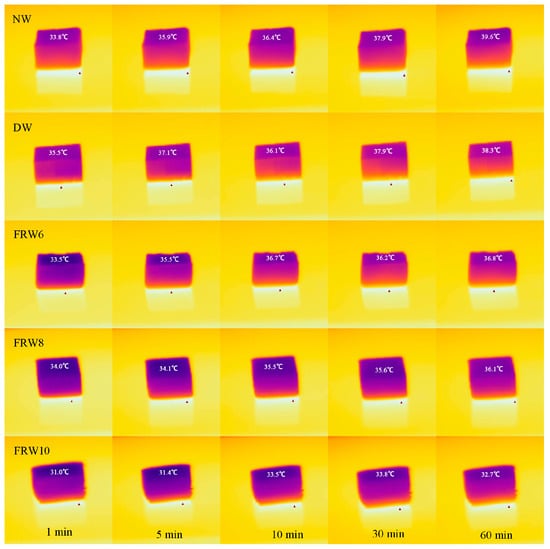 Thermal insulation tests were performed on NW, DW, and FRW6, FRW8, and FRW10. A 10 mm thick aerogel sample was placed on a 75 °C iron plate, and a thermal imaging camera was employed to measure the surface temperature of the sample at a distance of 10 cm from the iron plate at different time intervals. Figure 6 shows the thermal image. Evidently, the FRW10 exhibits the most pronounced thermal insulation effect. After 60 min of heating, the top surface temperature of the aerogel reaches a mere 33.8 °C, accompanied by a temperature difference (Δ) of 41.2 °C (Δ = 75 °C heating temperature minus the top surface temperature of the aerogel). In contrast, the NW has a top surface temperature of 39.6 °C. This significant enhancement in thermal insulation performance can be attributed to the incorporation of NaOH, which induces a looser interlayer structure within the aerogel matrix. Furthermore, an intensified structural transition is observed as the NaOH concentration increases. This altered structure impedes the upward heat transfer from the underlying layers, consequently endowing the FRW10 with superior thermal insulation properties.