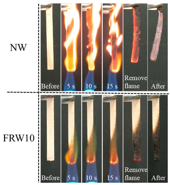 The flame retardancy of the aerogels was investigated using the direct flame ignition method with n-butane, as depicted in Figure 7. A comparative analysis of the combustion behavior between the NW and the FRW10 was conducted. The NW exhibited rapid ignition upon flame application and complete combustion within 15 s, leaving behind only a marginal amount of residual charred debris. It reveals the absence of any inherent flame-retardant properties of the NW. In contrast, the FRW10 swiftly formed a char layer on its surface following flame exposure. After a duration of 15 s, flame propagation was effectively curtailed, indicative of the aerogel’s self-extinguishing capability. Upon removal of the ignition source, the FRW10 promptly ceased to burn, underscoring its superior self-extinguishing characteristics. This behavior can be attributed to the loss of crystalline water from sodium borate and zinc borate during combustion, resulting in the dilution of ambient oxygen concentration and reduction in environmental temperature. Furthermore, the molten sodium borate and zinc borate function as heat absorbers during combustion, concurrently forming a protective layer on the surface of the aerogel. This protective layer effectively isolates oxygen and heat. Additionally, the presence of urea in the flame-retardant wood aerogel leads to the release of NH3 during heating, thereby diluting the concentration of oxygen around the aerogel. Consequently, the combustion conditions necessary for burning are not met, effectively suppressing the combustion process [39].