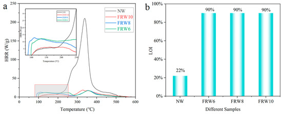 (a) HRR; (b) LOI diagram of different samples. According to ASTM D7309-2007 standard, the MCC test heats the sample from 30 °C to 600 °C at a rate of 10 °C/min−1 under a pure nitrogen atmosphere. According to ASTM D2863-2009, LOI test was carried out after the samples were kept at 25 °C ± 2 °C with 50% ± 5% humidity for 24 h.