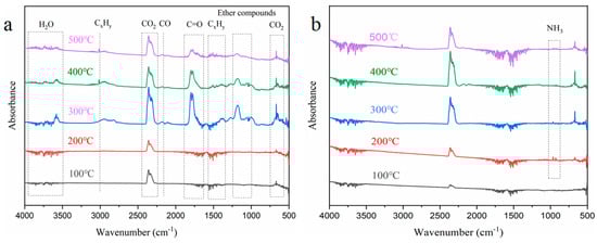 The thermal decomposition of the flame-retardant aerogel was analyzed using thermogravimetric analysis coupled with infrared spectroscopy (TG-IR). The results, as shown in Figure 9, reveal distinct peaks in the spectra of the NW precursor, indicating the release of various gaseous components. Specifically, peaks corresponding to H2O, aliphatic chains or hydrocarbon chains, CO2, CO, carbonyl compounds, ethers, and CO2 were observed in the wavenumber ranges of 3750–3500 cm−1, 3020–2790 cm−1, 2400–2260 cm−1, 2150 cm−1, 1870–1650 cm−1, 1232–1030 cm−1, and 750–600 cm−1, respectively [40,41]. The TG-IR analysis of the FRW10 indicated the release of these gaseous species during the experimental procedure, albeit with notable variations in release time and quantity. Additionally, a characteristic peak at 700–1100 cm−1, attributed to NH3, was observed exclusively in the FRW10 [42]. Upon heating, the volatile components from the NW were gradually released, exhibiting peaks for hydrocarbons, ethers, carbonyls, and CO. Notably, the peak release of these gases occurred around 300 °C. The general trend of gas evolution from the FRW10 was similar to that of the control sample, albeit with distinct variations in peak intensities. Specifically, the intensities of combustible gases, such as ethers, carbonyls, and CO, were significantly reduced, while the peak intensity of water vapor was notably enhanced. The peak release of gases was observed around 400 °C.