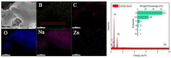SEM observation of the residual char obtained after the combustion of the FRW10 revealed minimal changes in the overall structure of the aerogel, while the flame-retardant particles on the surface disappeared (Figure 10). Instead, a continuous, dense, and expanded carbon layer was formed, and EDS showed that Na content increased significantly. This phenomenon can be attributed to the release of NH3 gas from urea upon heating, which, in conjunction with the molten sodium borate forming a protective layer, facilitated the expansion of the carbon layer. Furthermore, zinc borate decomposed into ZnO and B2O3, with B2O3 participating in the formation of a cross-linked network within the char, leading to increased density and effective isolation of gas exchange between the interior and exterior of the aerogel. These mechanisms contributed to improved flame retardancy and the self-extinguishing behavior of the flame-retardant aerogels.