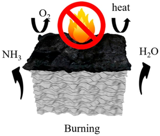 The flame-retardant mechanism is depicted in Figure 11. During the heating process, borax and zinc borate undergo dehydration, releasing water vapor that evaporates into the surroundings, thereby diluting flammable gases and absorbing heat. Notably, the combustion process does not generate any toxic, flammable, or corrosive gases. At approximately 160 °C, urea undergoes thermal decomposition, releasing NH3, which further dilutes the oxygen concentration in the surroundings. Subsequently, boron acid and zinc borate promote surface fiber carbonization, while molten borax forms a glassy protective layer on the aerogel surface. The resulting metal oxides, namely ZnO and B2O3, form a continuous and dense protective layer that retards heat propagation, suppresses the release of volatile combustible gases, and provides internal fiber protection [43]. Additionally, the inherent layered structure of the aerogel contributes to its heat barrier properties. As a result, the combustion process becomes hindered, leading to the self-extinguishing behavior of the aerogel.