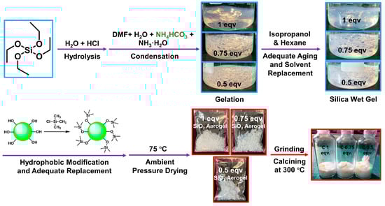 Tetraethoxysilane (TEOS, 99%), chlorotrimethylsilane (TMCS, 98%), and ammonium bicarbonate (NH4HCO3, 99%) were purchased from Innochem Science & Technology Co., Ltd., Beijing, China. Ethanol (EtOH, 99.5%), N, N-dimethylformamide (DMF, 99.5%), isopropanol (i-PrOH, 99.7%), and n-hexane (n-Hex, 97.0%) were purchased from Shanghai Aladdin Biochemical Technology Co., Ltd., Shanghai, China. Hydrochloric acid (HCl, AR) and ammonia water (with 25 wt% ammonia dissolved) were purchased from Beijing Chemical Factory, Beijing, China. All the chemicals were used without further purification.