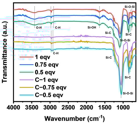 The chemical structure of each silica aerogel was analyzed by FT−IR spectra, as shown in Figure 2. The positions and intensities of the absorption peaks of 1 eqv, 0.75 eqv, and 0.5 eqv were essentially the same, indicating that silica aerogels had similar chemical structures. Strong absorption peaks for Si-O-Si were located at 1088 cm−1 and 780 cm−1 [26]. Stretching vibrations of Si-C bonds were found at 1255 cm−1, 847 cm−1, and 759 cm−1. Symmetric and asymmetric stretching vibrations of C-H bonds at 2961 cm−1 and 2904 cm−1 indicated the presence of Si-CH3 [27,28], suggesting that the gel underwent hydrophobic modification. However, a broad peak at 3440 cm−1 for OH stretching vibrations [29] and a peak at 1659 cm−1 for Si-OH bending vibrations indicated the presence of Si-OH or adsorbed water within the silica aerogels [30], suggesting that the hydrophobic modification might not be sufficient. After calcination at 300 °C, C-1 eqv, C-0.75 eqv, and C-0.5 eqv aerogels showed significant reduction in Si-OH and OH absorption peaks, indicating removal of adsorbed water and the potential conversion of Si-OH bonds to Si-O-Si bonds. The corresponding increase in the absorption peaks for Si-O-Si bonds and the more pronounced stretching vibrations for Si-C bonds suggested that the main component of the gel skeleton did not undergo significant changes during calcination.
