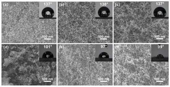 SEM images and contact angle images of silica aerogels; (a) 1 eqv, (b) 0.75 eqv, (c) 0.5 eqv, (d) C-1 eqv, (e) C-0.75 eqv, (f) C-0.5 eqv. No significant change in the morphology of gel skeletons before and after calcination was observed. All silica aerogels obtained high porosity and nanoscale pores.
