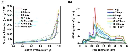 Based on the results from the thermogravimetric analyzer, the initial decomposition temperature of NH4HCO3 is approximately 70 °C, and that of NH4Cl is around 170 °C, as shown in Figure S1. Consequently, the silica aerogel samples, 1 eqv, 0.75 eqv, and 0.5 eqv, were ground into powder using a mortar and placed in a muffle furnace. The temperature was set to 300 °C. The samples were calcined for 3 h. Afterwards, heating was turned off and cooling to room temperature took place. Corresponding calcined silica aerogels were named as C-1 eqv, C-0.75 eqv, and C-0.5 eqv, respectively.