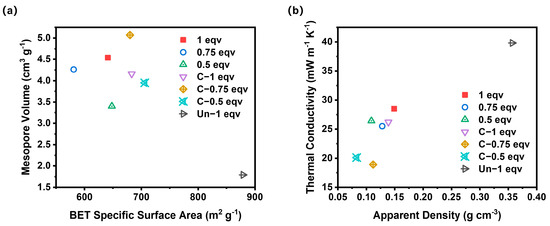 To analyze the impact of various factors on the thermal conductivities of silica aerogels, BET specific surface area, mesopore volume, apparent density, and thermal conductivity of all aerogel samples were compared simultaneously, as shown in Figure 6. Among them, C-0.75 eqv exhibited the lowest thermal conductivity of 18.9 mW m−1 K−1. This is mainly due to the volume of mesopores distributed below 69 nm obstructing convective heat transfer, and the lower density reducing the solid-phase heat transfer within the aerogel. If the silica aerogels are ranked solely based on their mesopore volume, the thermal conductivity from lowest to highest would be C-0.75 eqv, 1 eqv, 0.75 eqv, C-1 eqv, C-0.5 eqv, and 0.5 eqv. However, the actual thermal conductivity from lowest to highest is C-0.75 eqv, C-0.5 eqv, 0.75 eqv, C-1 eqv, 0.5 eqv, and 1 eqv. The most significant deviations from the mesopore volume ranking are observed with C-0.5 eqv and 1 eqv, which is attributed to differences in the stacking degree of the gel skeleton. Higher porosity with a more dispersed gel skeleton contributes less to solid-phase heat transfer. Correspondingly, C-0.5 eqv silica aerogel had the lowest density among all samples, at 0.083 g cm−3, whereas 1 eqv, with a higher silicon source content and undecomposed ammonium salts within its pores, had a density as high as 0.149 g cm−3. Even though 1 eqv had a relatively higher mesopore volume, its thermal conductivity only reached 28.5 mW m−1 K−1. In contrast, Un-1 eqv silica aerogel had a thermal conductivity as high as 39.8 mW m−1 K−1, further illustrating the effectiveness of the APD-assisted foaming method in enhancing the expansion volume of spring-back, thereby reducing both solid-phase heat transfer and air convection within the aerogel, achieving remarkable thermal insulation properties.