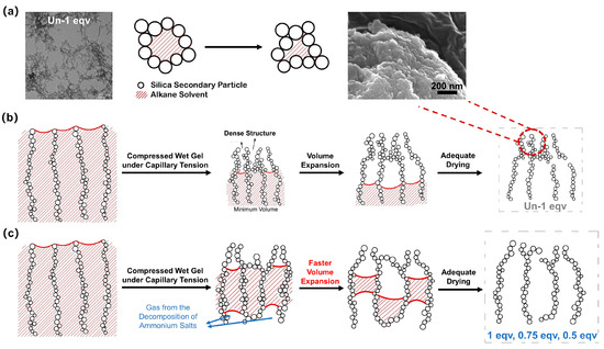 Based on the analysis of the reasons behind the spring-back effect, an APD-assisted foaming method for enhancing the spring-back effect is depicted in Figure 7c. By introducing NH4HCO3 into the silica sol, NH4HCO3 can be evenly dispersed within the gel pores upon gelation. The drying temperature for ambient pressure drying is set at 75 °C, at which the NH4HCO3 within the pores starts to decompose and generate gas. This process creates a positive pressure environment conducive to spring-back. As shown in Video S1, the 1 eqv silica aerogel made by the APD-assisted foaming method exhibited spring-back earlier and with a greater volume expansion compared with Un-1 eqv. Compared to the original preparation method without NH4HCO3, 0.75 and 0.5 equivalents of TEOS completed gelation within a short period, and both gels had certain strength to withstand subsequent procedures. This is mainly oriented from increasing the electrolyte concentration in a colloidal dispersion that compresses the electrical double layer around the particles [33]. The silica secondary particles are more prone to coagulate due to the attractive force between uncharged particles and the reduced repulsive barrier.