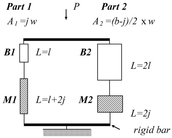By using Equations (15)–(22), the overall behavior of masonry including creep can be demonstrated. If we consider continuum damage in either component as a function of time, the loads redistributed to each part can be determined because the stiffness at time t in Equations (17) and (18) would vary with respect to time [21]. On the other hand, if all material components stayed in the elastic stress region for the service load level, Em(t) and Eb(t) in Equations (13) and (14) can be treated as constant as Em and Eb, respectively. Therefore, Equations (15)–(22) can be solved for stress in Part 2 as