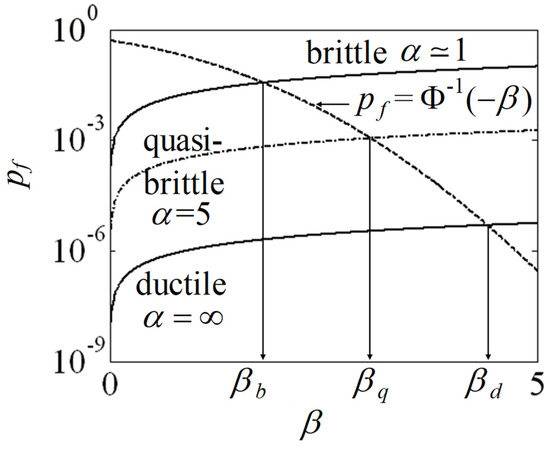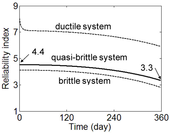 It is noticeable that while the reliability index of ductile materials depends on the load level in each part, the reliability index of brittle materials only depends on the overall load. With the reliability index of quasi-brittle material βq being between these two bounds, the reliability index of quasi-brittle materials depends on both the load level in each part and the overall load.