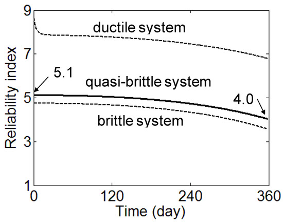 Considering the system reliability of a quasi-brittle system, the change in the reliability index with time is determined in Figure 6 and Figure 7. At the initial time, the reliability index for the brittle system βb and ductile system βd are calculated as 4.1 and 8.0, respectively. Although the applied load level is determined based on the target reliability index of 4.0 considering the masonry panel strength, the reliability index for brittle system βb is slightly higher than the target reliability index βtarget. This is because the masonry panel is considered as a system of mortar and brick. System reliability analysis is based on that two-column structure is more reliable than a one-column structure if those structures have the same resisting strength to load. For the result of 8.0 for βd, it is too risky for the design to assume that the masonry panel will respond in a ductile system. With the final strain to the elastic strain ratio α of 5, βq is calculated as 4.5 at the initial time and decreases to 3.3 at the time of 360 days. The results show that the reliability of the masonry panel under a sustained load decreases with time. It is noticeable that as the ductility of the quasi-brittle material increases due to a confining stress effects on materials [25], a modification of the ductility number λ for mortar, which lies in the tri-axial compressive stress state [26], will be needed.
