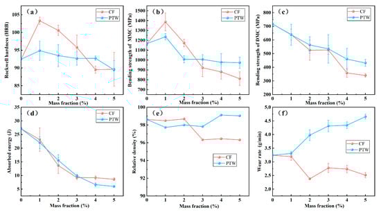 Relationships between sample mechanical properties and the content of CF and PTW: (a) hardness; (b) bending strength of MMC; (c) bending strength of DMC; (d) impact toughness; (e) relative density; (f) wear rate under impact condition.