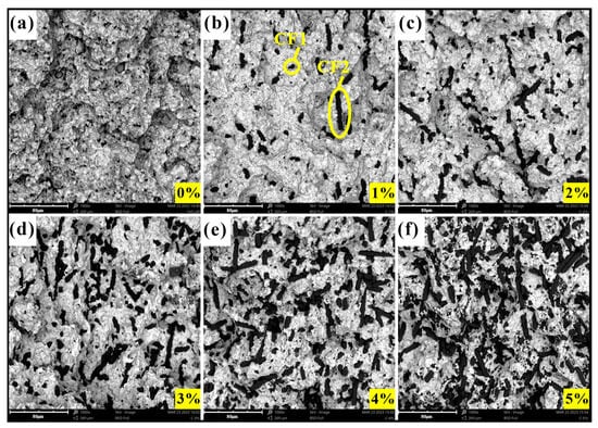 SEM image results of the fracture surface after the bending strength test are shown in Figure 3 and Figure 4. It can be observed that there were more or fewer pores in the matrix, which was due to the hot-pressing sintering process. The increase in the content of added materials can be clearly observed in the figure. The distribution states of the CFs and PTWs in the matrix were also different. The CFs maintained their original state well and were completely embedded in the matrix, whereas the PTWs, due to their small size, underwent significant aggregation after mixing and sintering, and the bonding with the matrix was not too tight. Adding a small amount of CF and PTW increased the hardness of the matrix. Generally speaking, the smaller the grain size, the greater the strength of the interface [38]. Therefore, the increase in matrix hardness might have been due to the obstruction of grain size growth by the CF and PTWs. The fracture surfaces in Figure 3a–c and Figure 4a–c show that adding an appropriate amount of CF and PTW improved the grain uniformity of the matrix material. However, the hardness began to decrease as the content continued to increase. An excessive addition of materials reduced the uniformity of the grain size of the matrix, and there was a greater probability that the measurement point might fall on the added material during measurement.