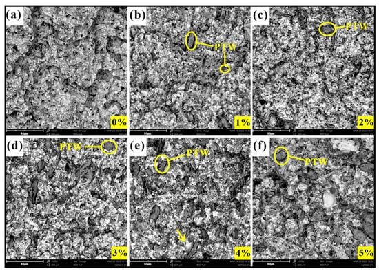 The fracture morphology of MMC: (a) 0 wt% PTW; (b) 1 wt% PTW; (c) 2 wt% PTW; (d) 3 wt% PTW; (e) 4 wt% PTW; (f) 5 wt% PTW.