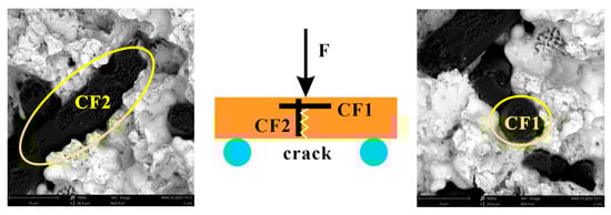 The bending strength of the sample was influenced mainly by the bonding conditions between the materials and the relative density. For the same material, the higher the relative density, the stronger the material. When other materials were added, the strength of the composite related also to the properties of the newly added material, as well as the bonding strength between the interfaces of different materials. As shown in Figure 5, the three-point bending test is an experimental method for testing the mechanical properties of composites. The specimen was placed on two supporting cylindrical beams at a specified span of 24.5 mm, and a downward load at a loading speed of 20 N/s was applied to the specimen at the middle of the span. When the three contact points of the specimen formed two equal torques, three-point bending occurred, and the specimen fractured at the midpoint. Carbon fibers were distributed randomly in the sample, and states 1 and 2 were the two critical states that CFs exhibited in the matrix. There, CF1 was perpendicular to the fracture surface and the direction of the loading force, whereas CF2 was parallel to the fracture surface and the direction of the loading force. However, in fact, CFs in other directions of space could also decompose the loading force into forces perpendicular to and parallel to the CFs, and this type of CF-reinforced specimen with CFs perpendicular to the loading force had the strongest fracture resistance. For the loading conditions in Figure 5, when the specimen failed, there was not only the bonding force between the CFs and the matrix but also the failure strength of CF1. For CF2, only the bonding force existed between the CFs and the matrix. When external forces acted on the matrix, the CFs could reduce the stress concentration in the matrix by absorbing and dispersing the stress while also inhibiting crack propagation. When the CF content continued to increase, the CFs began to contact each other, reducing the bending strength of the MMC. A small amount of PTWs could be uniformly distributed in the matrix. Due to the different thermal expansion coefficients, residual stress was generated after sintering at the interface between the PTWs and the matrix. When external forces were exerted on the sample, cracks were generated, and they extended to the interface. The whiskers prevented further crack propagation through bridging, crack deflection, a whisker pull-out effect, and crystal breakage, thereby improving the bending strength of the MMC. However, when excessive PTW agglomerated, the bending strength of the MMC decreased.