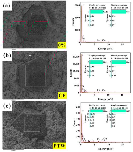 The performance of the diamond-containing samples depended mainly on the holding force of the matrix on the diamond. Generally, the holding force of the matrix on the diamond consisted of mechanical embedding and chemical bonding forces. The holding capacity largely determined the bending strength of the DMC. Mechanical inlay occurred during the cooling process after hot-pressing sintering. Because the thermal expansion coefficient of the metal matrix was much higher than that of the diamonds, the matrix generated a compressive stress on the diamonds during the cooling process, ultimately forming residual stress on the diamond surfaces to effectively hold the diamonds. The chemical bonding force was generated by the chemical reaction between some components in the matrix and the contact interface of the diamonds during the hot-pressing sintering process. The interatomic force can effectively hold the diamonds. Energy-dispersive spectroscopy spot scanning was performed on the diamond surface on the fracture surface of the DMC; the results are shown in Figure 6. For the diamond surface of DMC samples containing CF, only C, Fe, Cu, and O elements were detected, while for the samples containing PTW, K and Ti were also detected, indicating that some matrix elements had infiltrated or diffused onto the diamond surfaces. However, on the whole, adding the two materials reduced the bending strength of the DMC, because the matrix’s ability to hold diamonds decreased. As shown in Figure 7, CF and PTW can be clearly observed at the interface between the diamonds and the matrix, which greatly weakened the mechanical embedding force of the matrix to a certain extent.