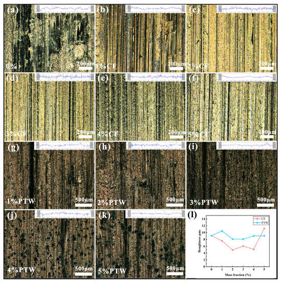 Optical topography and roughness of the worn surface: (a) 0 wt% CF; (b) 1 wt% CF; (c) 2 wt% CF; (d) 3 wt% CF; (e) 4 wt% CF; (f) 5 wt% CF; (g) 1 wt% PTW; (h) 2 wt% PTW; (i) 3 wt% PTW; (j) 4 wt% PTW; (k) 5 wt% PTW; (l) roughness.