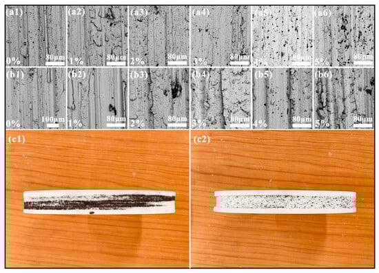 SEM micrographs of the worn surface and the corundum grinding wheel: (a1) 0 wt% CF; (a2) 1 wt% CF; (a3) 2 wt% CF; (a4) 3 wt% CF; (a5) 4 wt% CF; (a6) 5 wt% CF; (b1) 0 wt% PTW; (b2) 1 wt% PTW; (b3) 2 wt% PTW; (b4) 3 wt% PTW; (b5) 4 wt% PTW; (b6) 5 wt% PTW; (c1) corundum grinding wheel after impact wear test with samples (CF); (c2) corundum grinding wheel after impact wear test with samples (PTW).