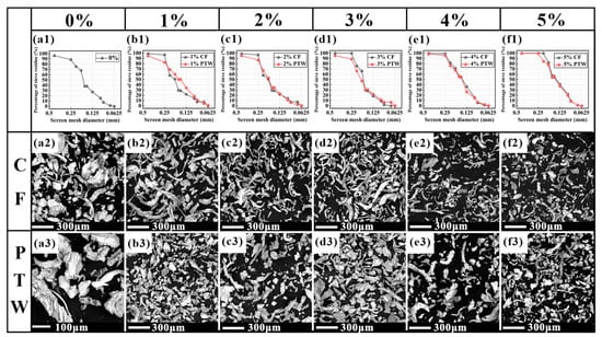 Abrasive particle gradation curves (first line) and SEM micrographs of the abrasive debris (the second and third lines): (a1) FJT-A2; (b1) 1 wt% CF and PTW; (c1) 2 wt% CF and PTW; (d1) 3 wt% CF and PTW; (e1) 4 wt% CF and PTW; (f1) 5 wt% CF and PTW; (a2) 0 wt% CF; (b2) 1 wt% CF; (c2) 2 wt% CF; (d2) 3 wt% CF; (e2) 4 wt% CF; (f2) 5 wt% CF; (a3) 0 wt% PTW; (b3) 1 wt% PTW; (c3) 2 wt% PTW; (d3) 3 wt% PTW; (e3) 4 wt% PTW; (f3) 5 wt% PTW.