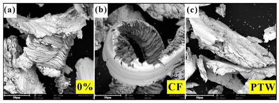 A magnet was used to distinguish the worn sample debris from the grinding wheel abrasive, and the abrasive debris was analyzed. A sieving test was performed on the abrasive debris, and the abrasive particle gradation curves are shown in Figure 10. Through the sieving test, it was found that the maximum particle size of the abrasive debris in the CF sample was smaller than that in the PTW sample. The maximum screen size used for the test was 40 mesh, through which the abrasive debris of the CF sample could pass, while the abrasive debris of the FJT-A2 and PTW samples could not pass. The average size of the abrasive debris of the CF samples was larger than that of the PTW samples when the material additions were 1 wt% and 2 wt%, while the results were just the opposite at other addition amounts. It was difficult to visualize the impact wear performance of the samples from the abrasive particle gradation curves, so a SEM analysis was performed on all abrasive debris. For the FJT-A2 sample, there were predominantly large chips as well as a few strips of chips, which corresponded to the adhesive and abrasive wearing described in Section 3.2.2. During the sample’s wear process, the interaction mechanism between the abrasive particles and the matrix became more complex due to the rotation of the grinding wheel and the periodic impact force. In the grinding area, the grinding process could be divided into scratch and plowing processes. When an impact was generated, the cutting depth between the grinding wheel particles and the matrix instantly increased, and the plowing effect dominated. The hardness and other properties of the material itself also determined the wear mechanism. Compared to PTW debris, it was evident that the abrasive debris of the CF sample was mainly continuous serrated chips, whereas the abrasive debris of the PTW sample was mainly banded chips.
