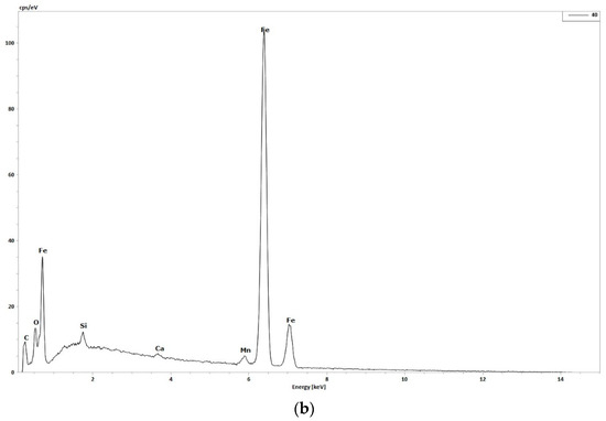 Sample BC3 had a specific BET surface of 179.23 m2·g−1. This composite was made on the basis of biomass impregnated with iron salts. The surface of the BC3 sample is heterogeneous and rough, with the presence of numerous cracks and cavities (Figure 2). This may indicate a large variation in pore sizes in the composites. The surface of the BC4 sample is similar. This may be the reason for the difference in the BET surface value characterizing samples BC3 and BC4. In the BC4 sample produced using a different method than the BC3 sample, the specific surface area could also have decreased due to the pores being blocked by iron compound particles. A similar situation was described by [47], the specific surface area was reduced in Fe-impregnated biochar as a result of blocking the pores with Fe3O4 formed in the pyrolysis process. The surface area of these biochars was smaller than in our studies, amounting to 2 m2·g−1, which was probably due to the substrate used for the production of biochar, which was MSW (municipal solid waste). Similarly, refs. [59,86] observed a reduction in specific surface area, pore diameter and total pore volume in iron-impregnated biochar when compared to raw biochar.
