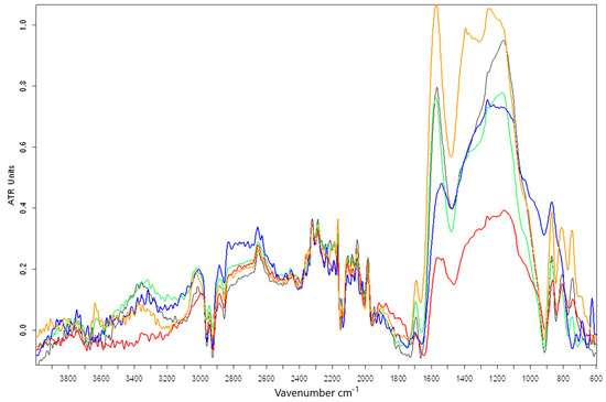 FTIR/ATR spectra of biochar B—yellow and composites: BC1—blue, BC2—red, BC3—green, BC4—black.