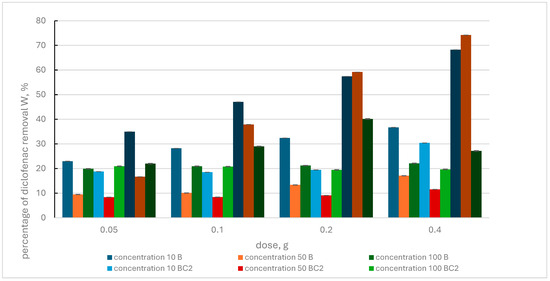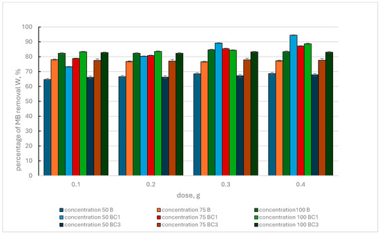 Comparing the results regarding the removal of MB from the solution using biochar and BC2 and BC4 composites (Figure 5), it can be seen that at an MB concentration of 50 mg·L−1 and an adsorbent dose of 0.1 g, the W value fluctuated in the range of 64.68–65.89%, without a clear dominance of one of the adsorbents.