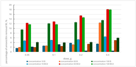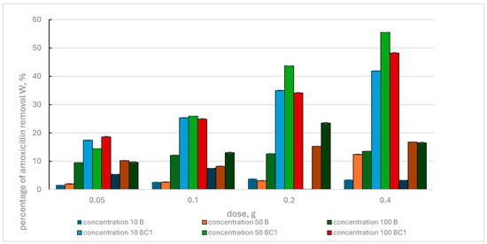 The effectiveness of the BC1 composite was significantly higher than the effectiveness of the BC3 composite and biochar. The maximum values of amoxicillin removal by BC1 at increasing doses of this adsorbent and amoxicillin concentrations of 10 mg·L−1, 50 mg·L−1 and 100 mg·L−1 were 41.86%, 55.49% and 48.18%, respectively. However, for the BC3 composite, the corresponding values were 7.54%, 16.75% and 23.51%. The least effective was biochar, for which the maximum values of the W parameter at increasing doses of this adsorbent and amoxicillin concentrations of 10 mg·L−1, 50 mg L−1 and 100 mg·L−1 were equal to 3.82%, 12.42% and 13.50%, respectively.