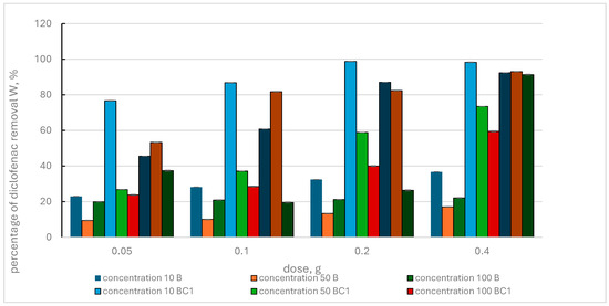 Percentage of methylene blue removal by biochar (B) and BC2, BC4 composites, depending on the initial MB concentration and adsorbent dose.