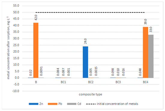 Weighted portions of 0.8 g were prepared from the prepared composites and biochar. Solutions with a metal ion concentration of 50 mg·L−1 were prepared. Biochar samples were placed in glass bottles and filled with the prepared solution of the tested metal ions. The bottles with the suspension were shaken on a laboratory shaker (150 rpm) for 24 h. The mixtures were then filtered through a hard filter (Waterman, Columbus, OH, USA) and a syringe filter (45 μm). The content of the elements Zn, Cd and Pb was determined in accordance with PN-EN ISO 11885:2009 Water Quality—Determination of Selected Elements by Optical Emission Spectrometry with Inductively Excited Plasma (ICP-OES).