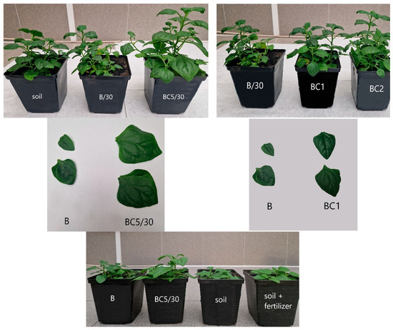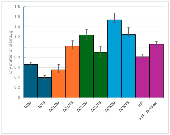 The soil intended for the experiment was dried until air-dry and then sieved through a sieve with a mesh diameter of 500 μm. Pots with a capacity of 1 L were prepared. In the pots, soil composite mixtures or biochar soil were placed on a layer of soil (400 g). The mixtures were prepared by mixing 400 g of soil with 15 g or 30 g of composites or biochar. The samples were marked as follows: B/30, B/15, BC1/30, BC1/15, BC2/30, BC2/15, BC5/30 and BC5/15. There were also 6 pots filled only with soil. The prepared substrates were left for 30 days. During this period, they were watered once every 7 days using 150 mL of distilled water.